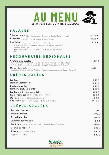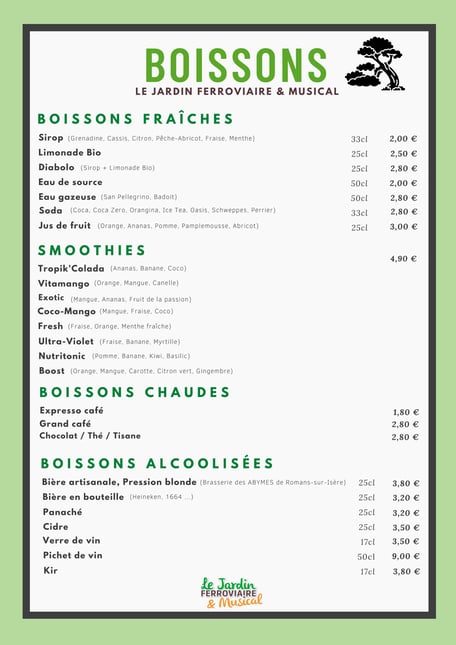 Pour votre déjeuner, un encas sur le pouce, un point de restauration est à votre disposition, sur la terrasse extérieure du Jardin Ferroviaire, à l'ombre d'un
